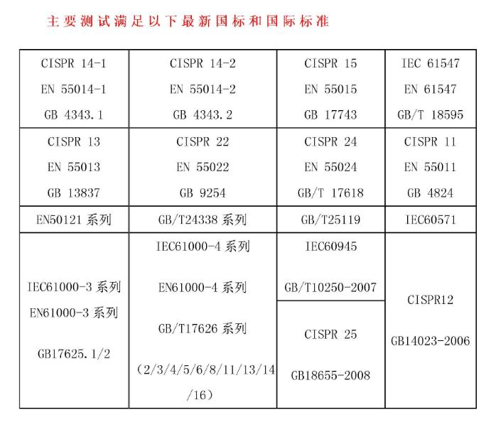 抗擾度測(cè)量(EMS):靜電放電(ESD)抗擾度、輻射電磁場(chǎng)抗擾度 、電快速瞬變/脈沖群(EFT/B)抗擾度、浪涌(雷擊)抗擾度、注入電流(輻射場(chǎng)感應(yīng)傳導(dǎo))抗擾度、工頻磁場(chǎng)抗擾度、電壓暫壓斷時(shí)中斷抗擾度、共模低頻傳導(dǎo)抗擾度、交流電源端口諧波諧間波和電網(wǎng)信號(hào)的低頻傳導(dǎo)抗擾度、振鈴波抗擾度、阻尼震蕩波抗擾度、脈沖磁場(chǎng)抗擾度等測(cè)試。